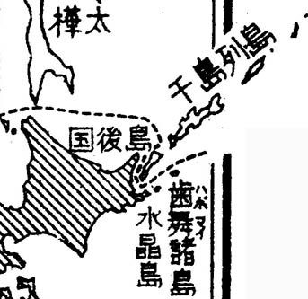 | 北海道地図の一部 クナシリ島は日本から省かれている。 水晶島が日本の領土のようになっている |